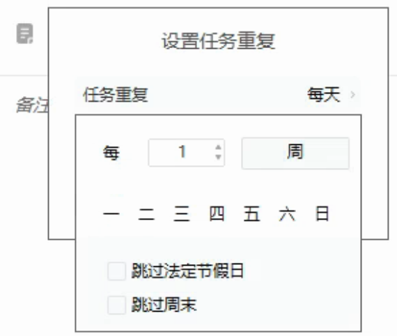 若任务重复频率设置为「自定义」时,支持选择是否需跳过法定节假日或周末。