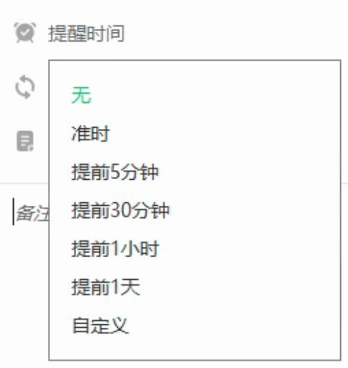 目前支持的提醒时间频率为:准时,提前5分钟,提前30分钟,提前1小时,提前一天以及自定义。