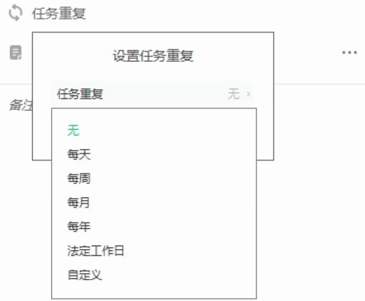 目前支持任务重复频率设定为:每天,每周,每月,每年,法定工作日,自定义。