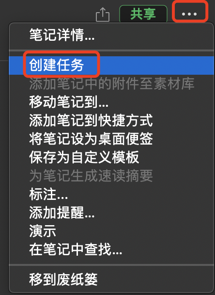 「mac端」打开一条笔记,点击笔记右上角「。。。」-「创建任务」