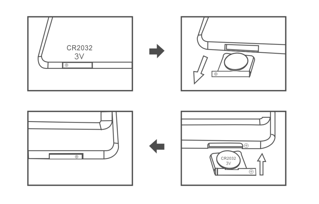 取出电池托-取出电池-更换CR2032[3V]纽扣电池-将电池托推入槽位