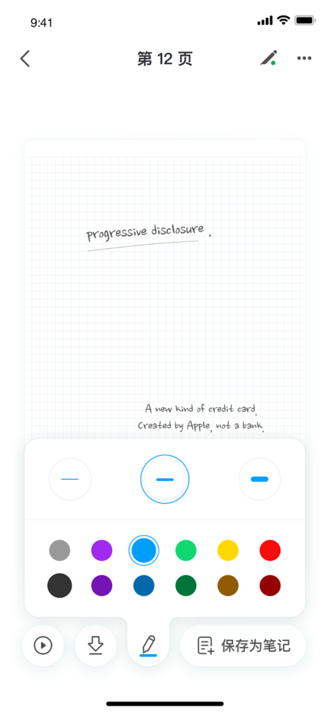①在App书写手稿页面中,点击书写笔设置,即可设置笔的显示颜色以及显示粗细。书写笔有3种粗细、12种颜色可设置。